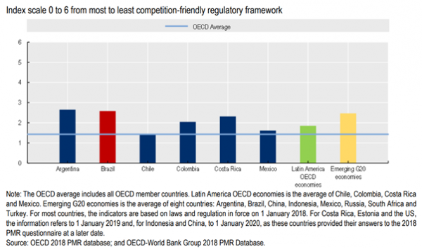 9. A OCDE mostra que o ambiente regulatório brasileiro ainda é menos amigável à concorrência do que a média da OCDE, e que persistem barreiras importantes à entrada e expansão de firmas.